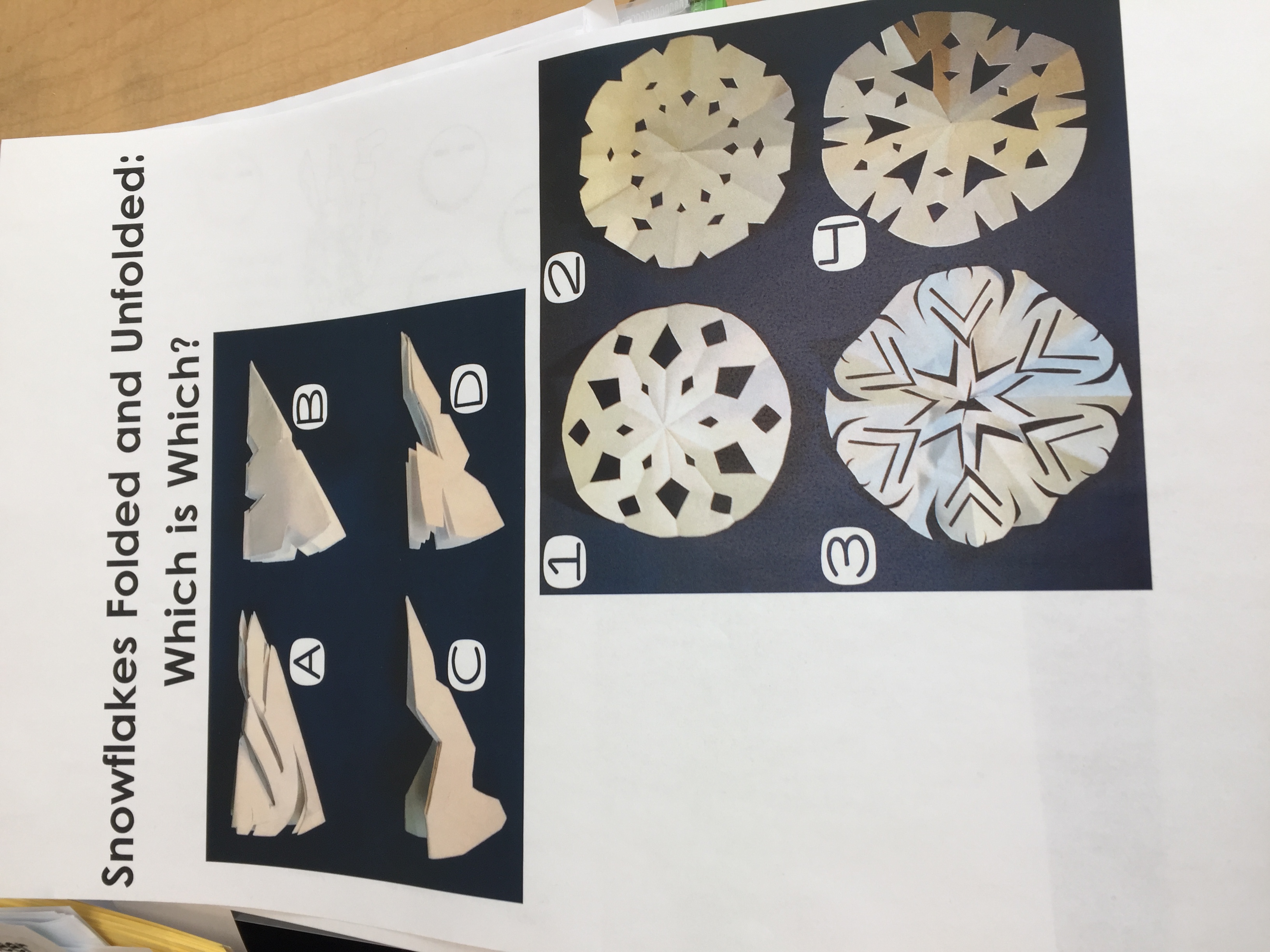 Starting with Snowflake Bentley, students were introduced to the story of where a snowflake came from. They also learned about the uniqueness of each snowflake and began to make some math connections. Students were then given images of folded snowflakes and had to justify and defend what it would look like open with their learning buddies. On the following session, students were then challenged to create snowflakes with specific features (e.g., six-sided, hole in the middle, star in the middle, eight-sided).