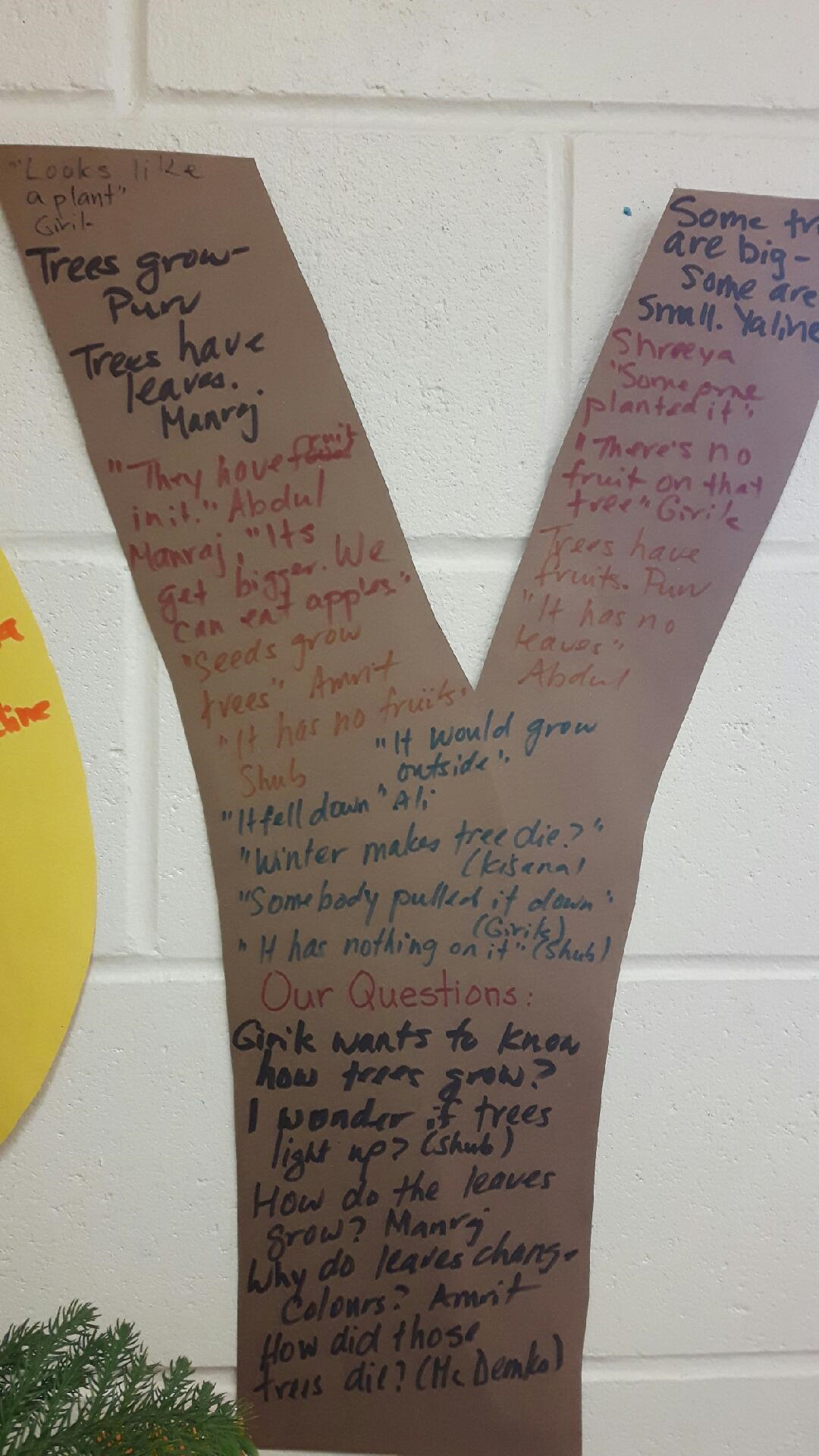 We started an inquiry when some students discovered a pear tree in the schoolyard. We used our five senses to start an investigation of several different fruits. We decided to visit an apple orchard in our community called Dixie Orchards. We also explored changes in the seasons and the effect on plants and animals in our community. We used books, videos, observations and our trip experiences to talk about the changes in our environment. We arranged to have Scientists in School come and provide more focused science activities. The students explored five stations: outer space, dinosaur fossil digging, making a mini volcano erupt, colour mixing and making fish prints. Next we took our students to a local conservation area where they learned about the Canadian maple tree and the process of turning sap into maple syrup. As spring approached, we provided the students with planting materials to help them learn and appreciate how they benefit our lives. Students had the chance to investigate and compare rocks. Students also enjoyed the planting experiences with vegetable seeds and herbs. They learned about the parts of the plants and life cycle, and continue to tend to their plants at home and the classroom.