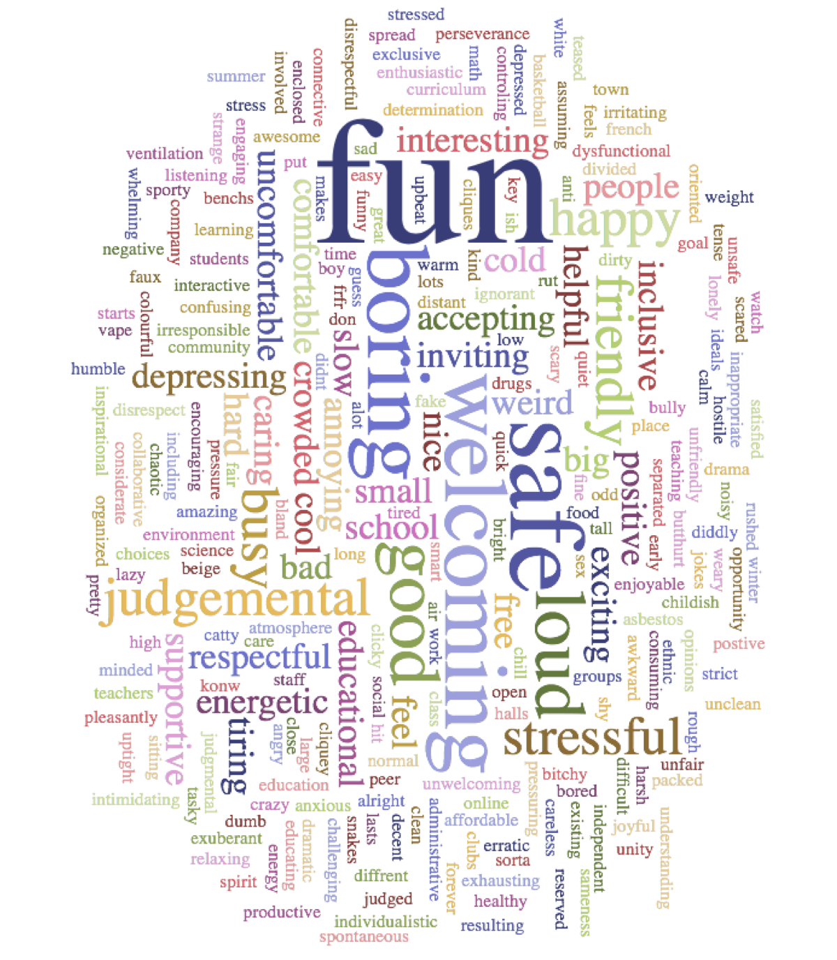 Our biggest takeaway from our survey is regarding our students’ perceptions. A concerning number of our students, 64 out of 247 respondents (26 per cent), don’t feel that they have an adult in our building that they feel safe coming to with a problem. We also learned that we have more non-binary students than we knew about. The diversity around our school is not well-represented in the public displays of artwork around the school. We learned that we have 23 out of 247 respondents (10 per cent) who speak another language at home. There needs to be greater emphasis on sexual diversity and religious/faith diversity in our curricular programming according to our survey.