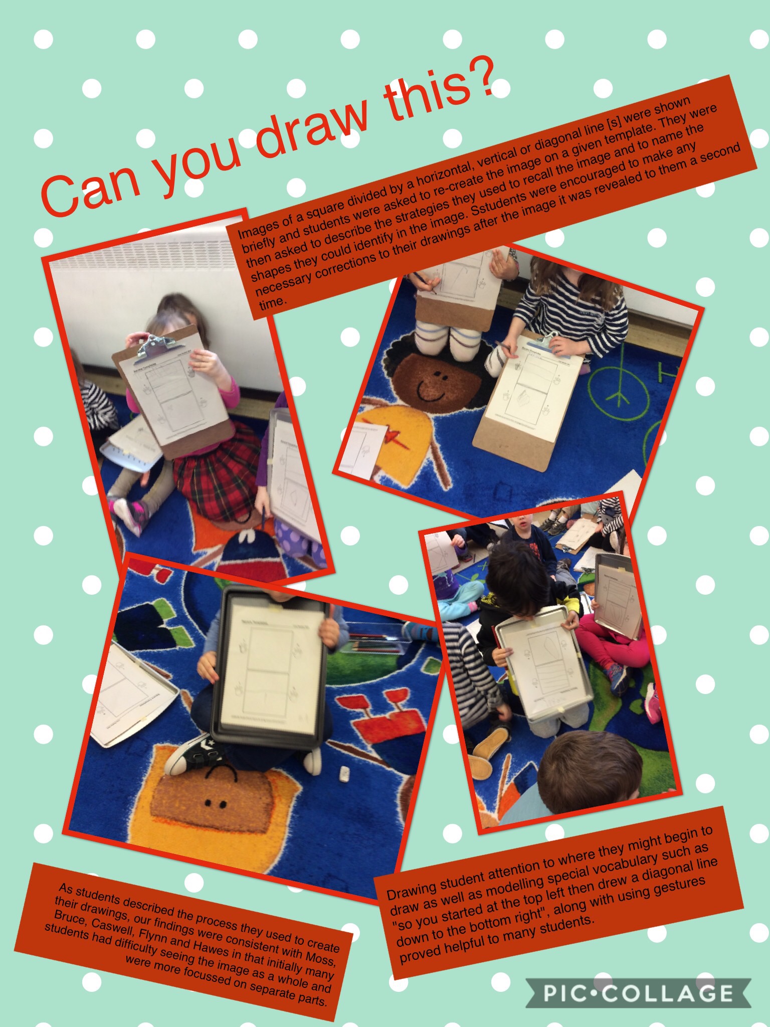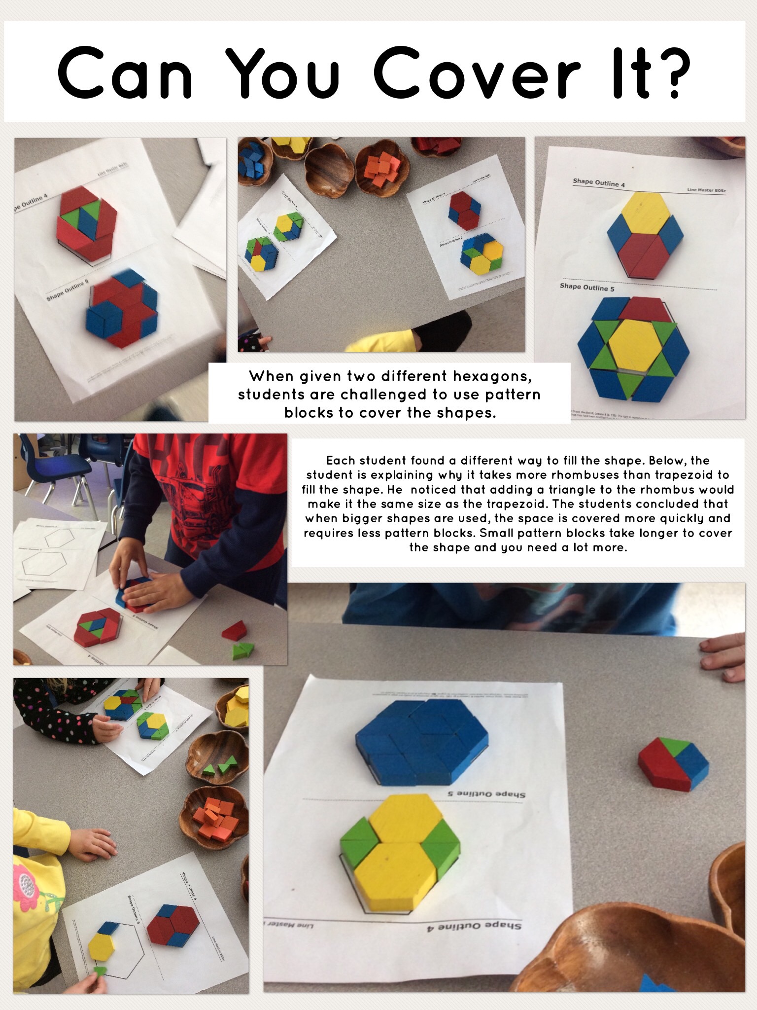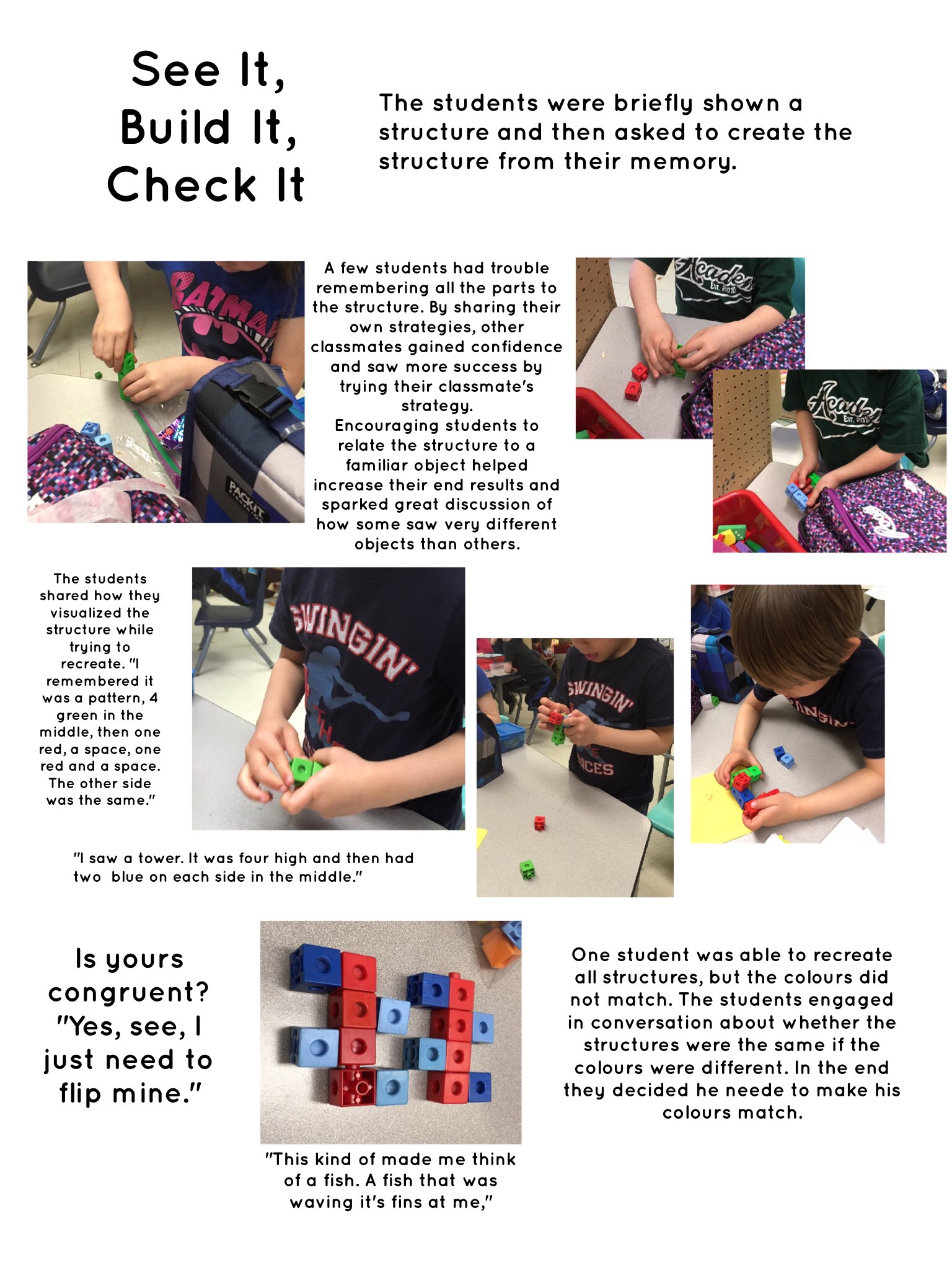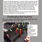 - Provided multiple opportunities for students to practise visualizing and verbalizing their visualization, as research shows that when children relate a whole shape to another familiar object it can reduce the task’s cognitive demand (Taking Shape, p. 222)