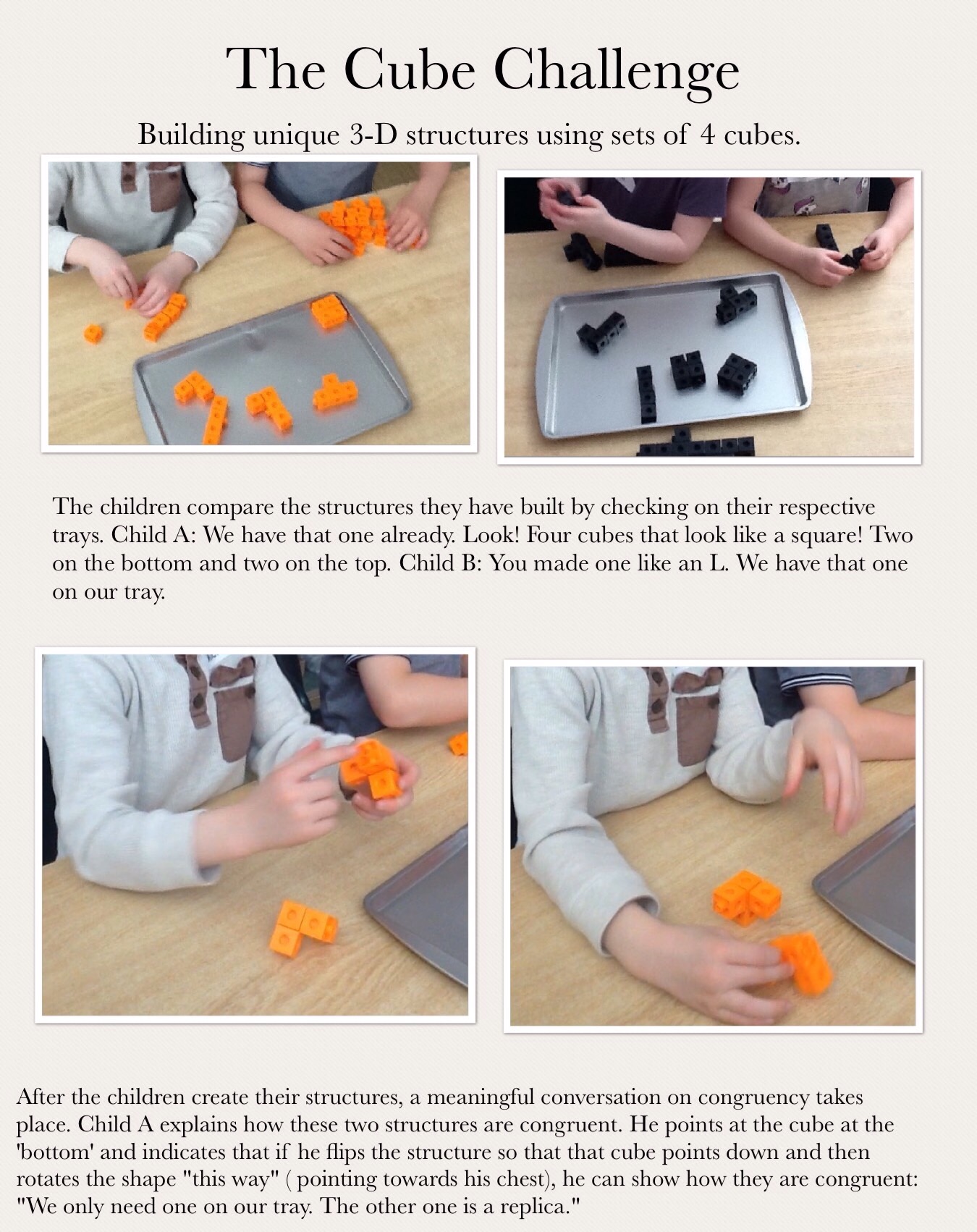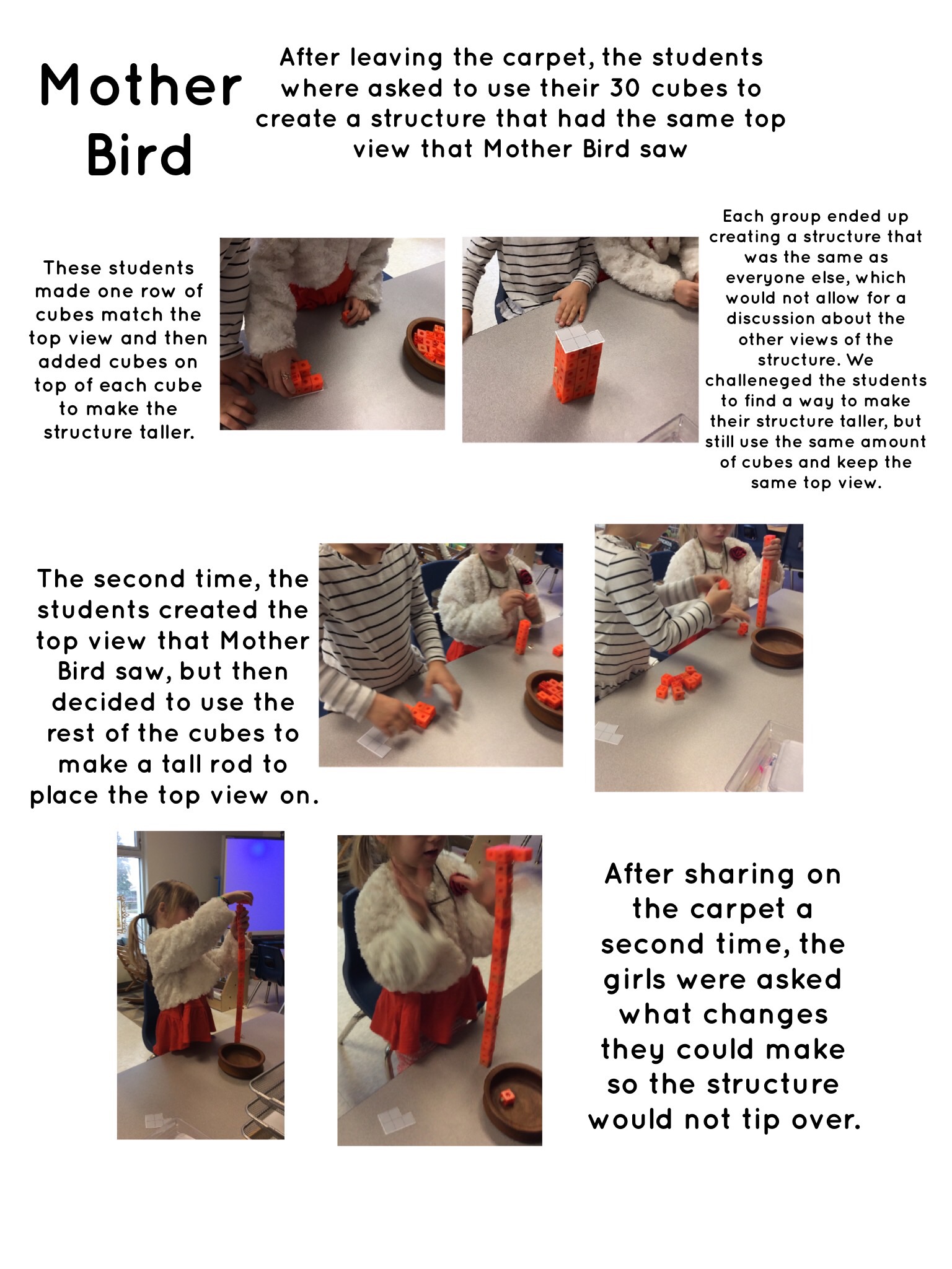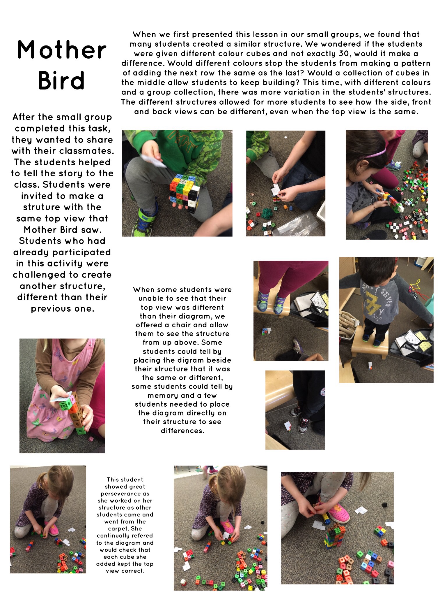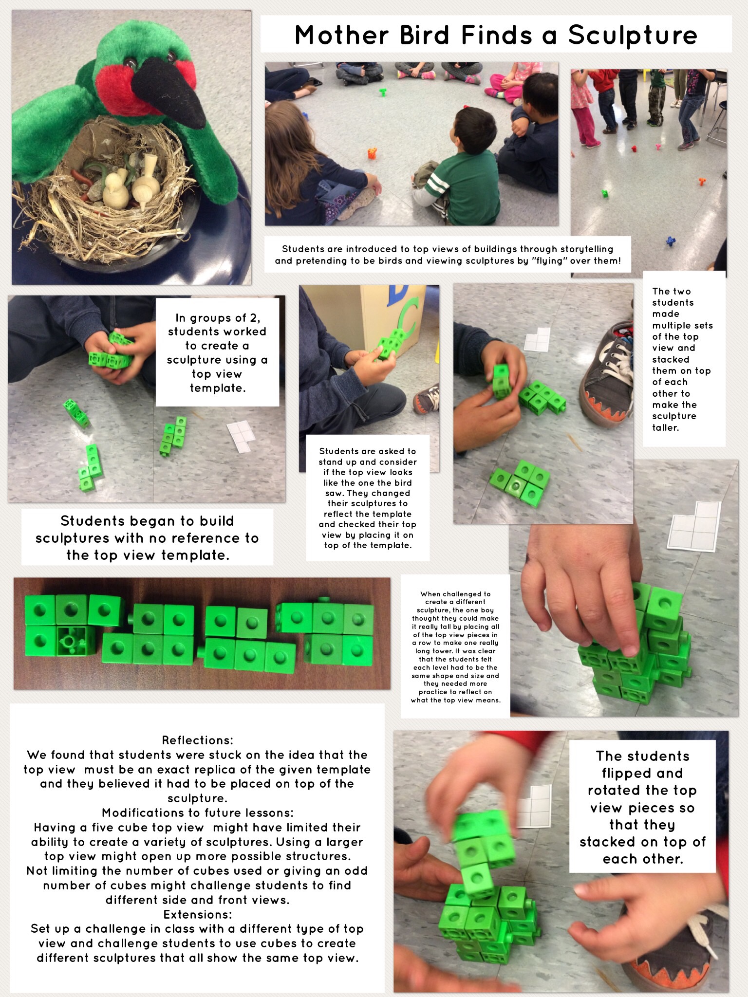 - Participated in co-planning meetings related to two guided lessons based on two lessons from the resource, Taking Shape. The Cube Challenge (Lesson 1 of Composing, Decomposing and Transforming Two-Dimensional Shapes, p. 149) and Mother Bird Finds a Sculpture (Lesson 1 of Perspective Taking, p. 217)