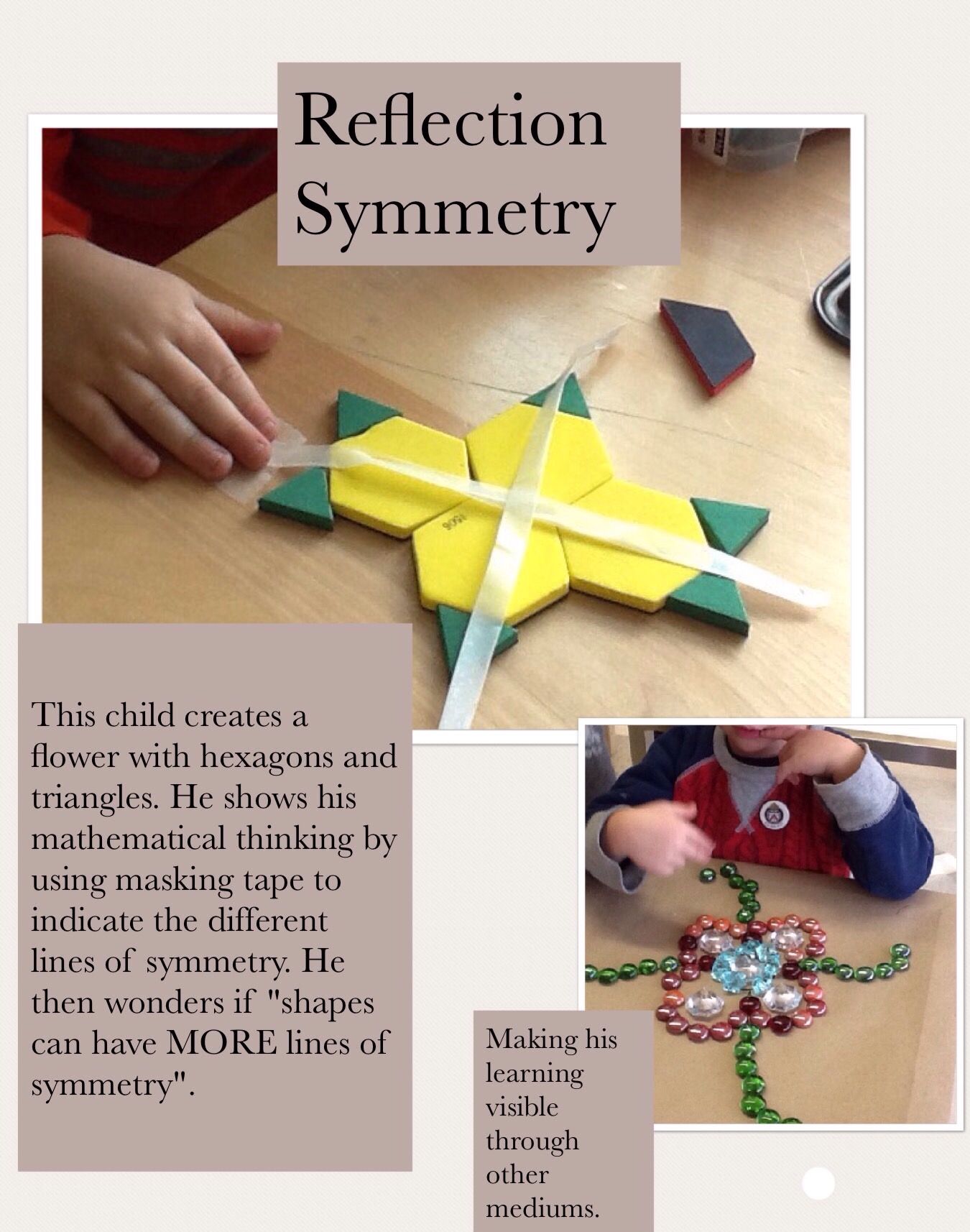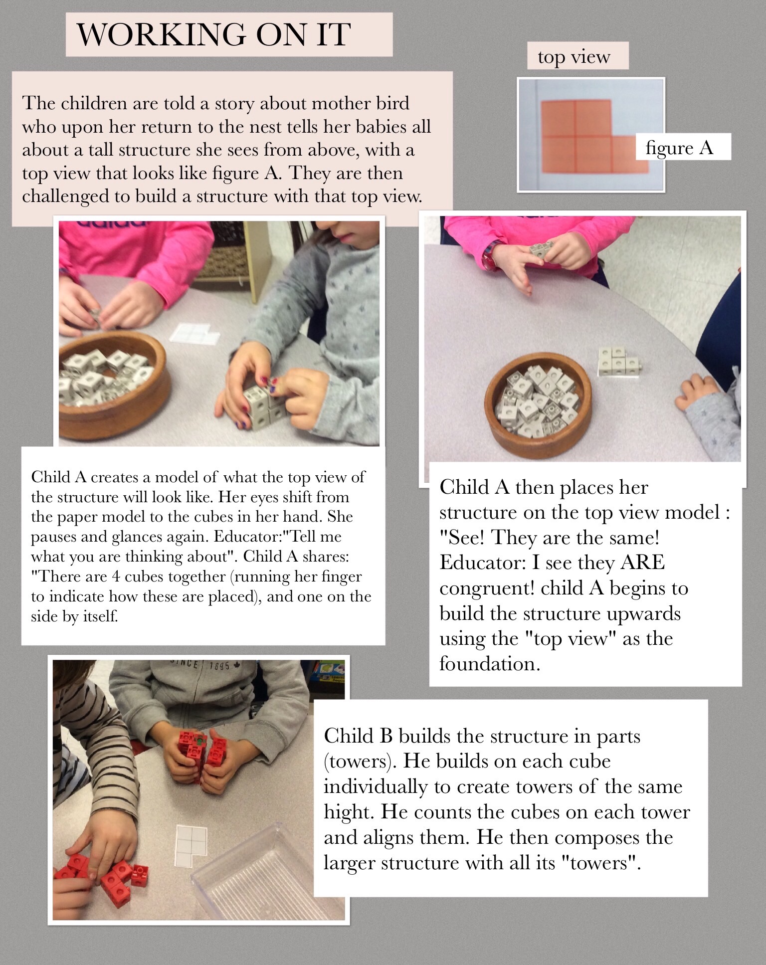 We read the book Taking Shape: Activities to Develop Geometric and Spatial Thinking Grades K-2 by Joan Moss and Catherine Bruce. Our goal was to deepen our understanding of spatial reasoning in early childhood, from a constructivist approach to learning. As we implemented different strategies from the text, we focused on asking intentional questions to respond, challenge and extend children’s learning. Throughout our research project, children investigated and practised skills and concepts by means of an inquiry, play-based stance. Children and educators’ thinking was made visible via pedagogical documentation.