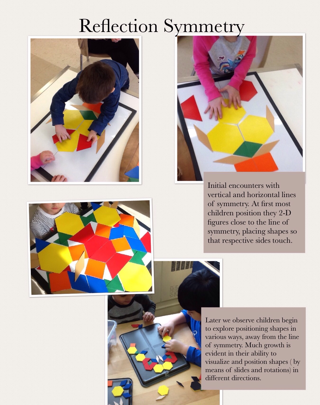 - Met on a monthly basis after school to discuss readings/researched related to spatial reasoning and to share reflections based on activities completed in the classroom from the book, Taking Shape