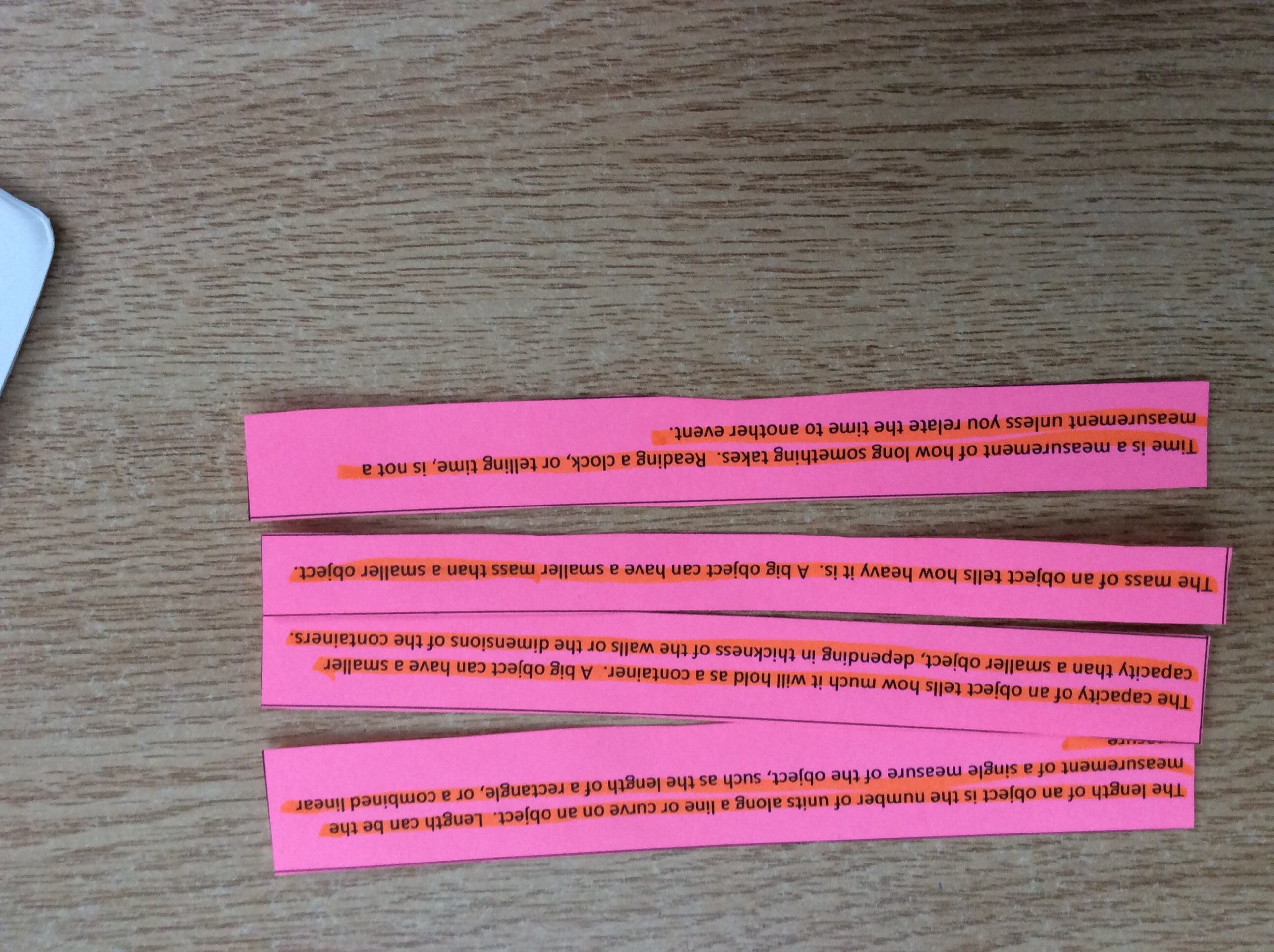 We first determined a usable list of big ideas that we could work with from resources from Marian Small. We took these big ideas and put them into sentence strips and clustered them by ideas that connect and work well together. We then determined one cluster of big idea connections that we wanted to target and work with. In this case, it was a cluster that was mainly based on Number Sense and Numeration, Measurement, and Data Management. We then designed a set of tasks that targeted these big ideas as an area of study and tried them out in our classrooms. We met a few times to reflect and refine these lessons. Our final task was going back to the big ideas and clustering them together to see how we could create an effective long-range plan for our math programs that develops deeper math understanding in our students.