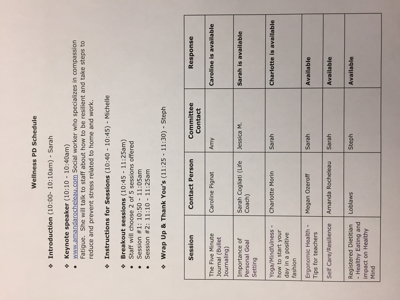 - Planned and organized a PD Day session for the entire staff around wellness including a keynote speaker and workshop presenters