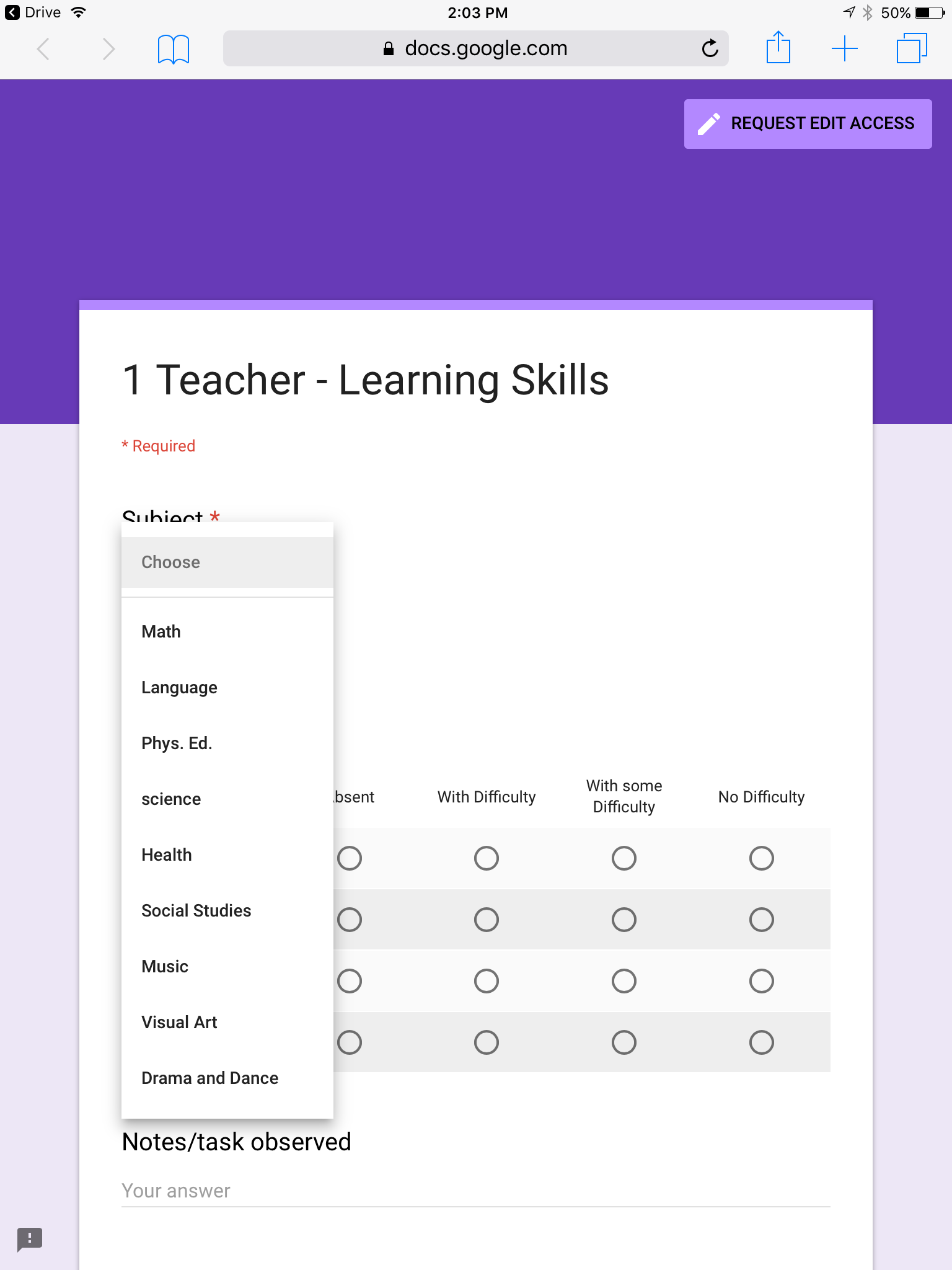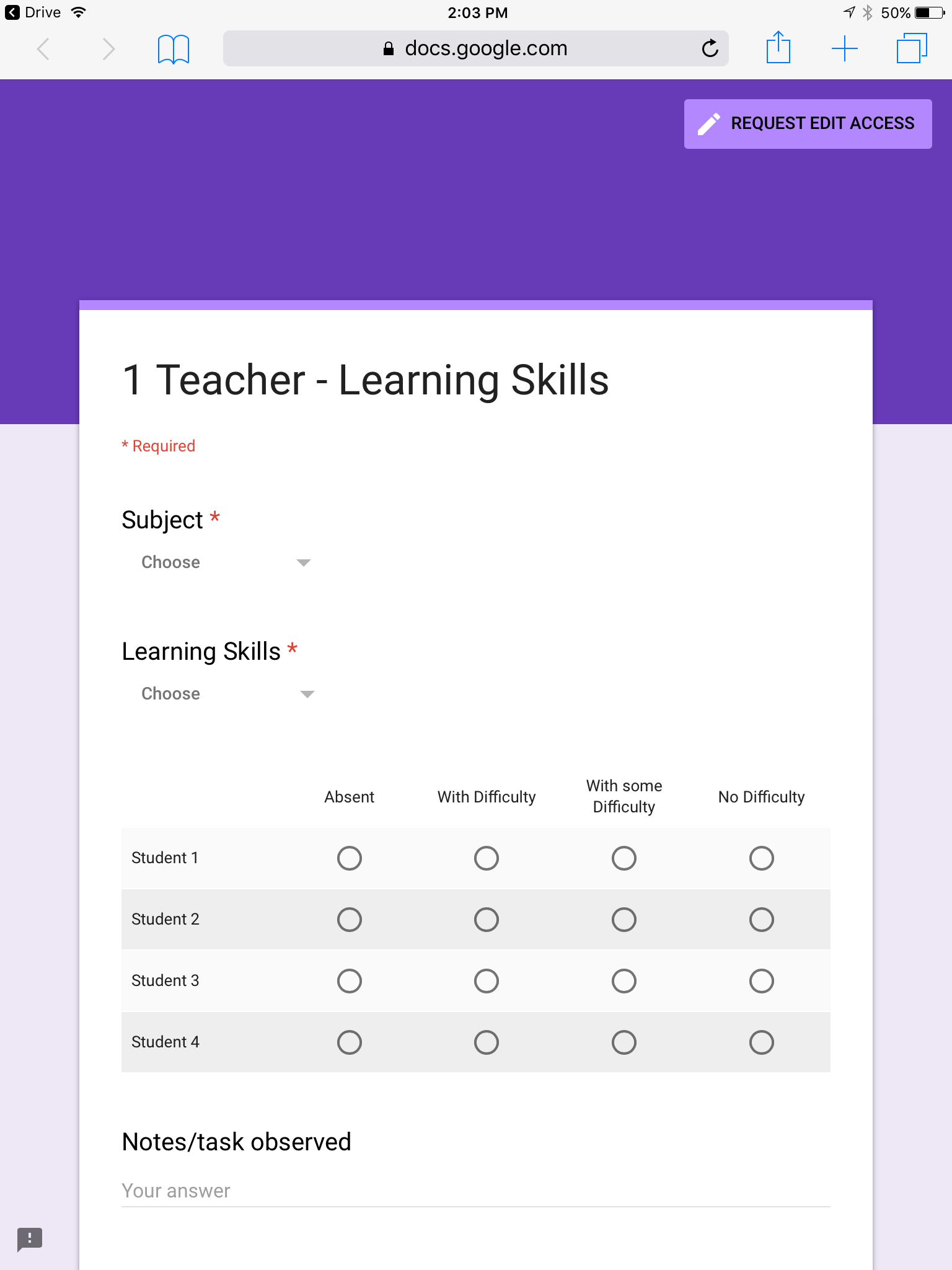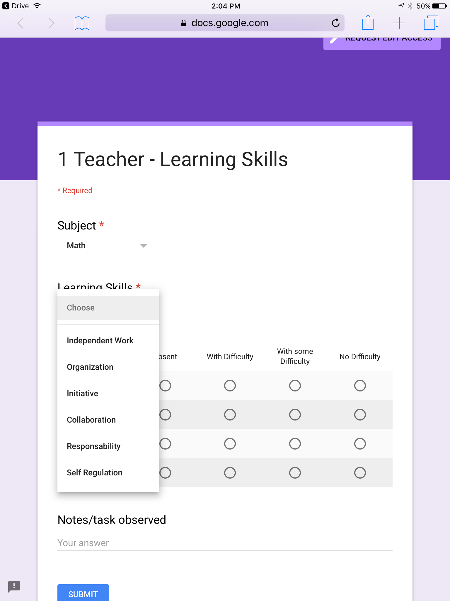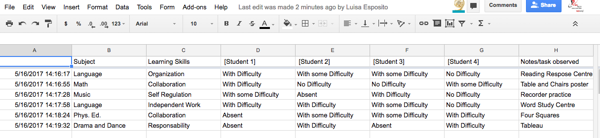 We wanted to make better use of the Google platform in order to create more effective and efficient assessment practices that will further and increase student achievement as well as accountability, both for the teacher and the students. We wanted to standardize forms for Learning Skills so that all teachers, including prep coverage teachers, could feel that their observations were shared with the homeroom.