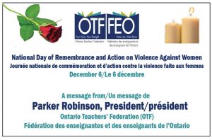← Back Breaking News December 4, 2020 December 6 – Message from OTF President Parker Robinson December 6 – National Day of Remembrance and Action on Violence Against Women Click on the image below to view OTF President Parker Robinson’s message.