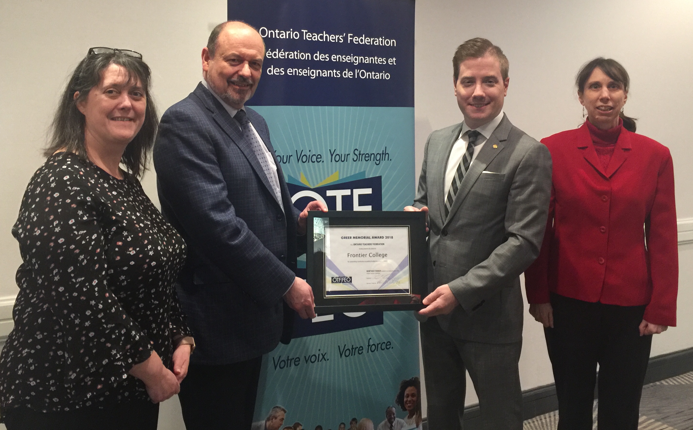 OTF and the Affiliates were proud to present the Greer Award to Frontier College, our partner in the promotion of literacy for many years.