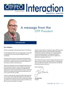 ← Back Breaking News October 4, 2023 Interaction – October 2023 – In this issue: Pensions, Action Table on Teacher Supply & Demand, World Teachers’ Day, Orange Shirt Day To view the latest issue of Interaction, click here.