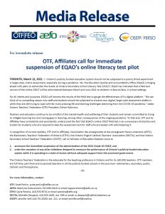 ← Back Breaking News March 12, 2021 OTF, Affiliates call for immediate suspension of EQAO’s online literacy test pilot Click on the image below