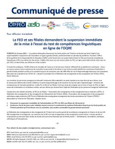 ← Retourner Nouvelles de dernière heure le 12 mars 2021 La FEO et ses filiales demandent la suspension immédiate de la mise à l’essai du test de compétences linguistiques en ligne de l’OQRE Cliquez sur l’image au dessous