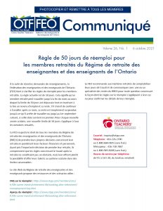 ← Retourner Nouvelles de dernière heure le 6 octobre 2021 Règle de 50 jours de réemploi pour les membres retraités du Régime de retraite des enseignantes et des enseignants Cliquez sur l’image ci-dessous