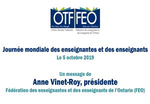 À l’occasion de la Journée mondiale des enseignantes et des enseignants, Anne Vinet-Roy, présidente de la FEO, reconnaît et félicite le dévouement et l’engagement des enseignantes et des enseignants des écoles financées par les fonds publics de l’Ontario.
